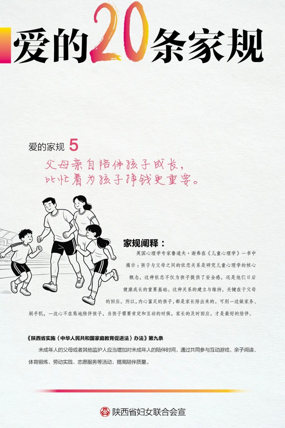 亲子关系的建立是从陪伴开始的,也因陪伴而加深。父母应树立正确的思想认识,不以“为孩子挣钱”为由减少陪伴孩子的时间,而是在工作之余经常陪伴孩子阅读学习、游戏互动、进行体育锻炼,让孩子切实感受到父母的关爱,为他们的健康成长奠定坚实的基础。