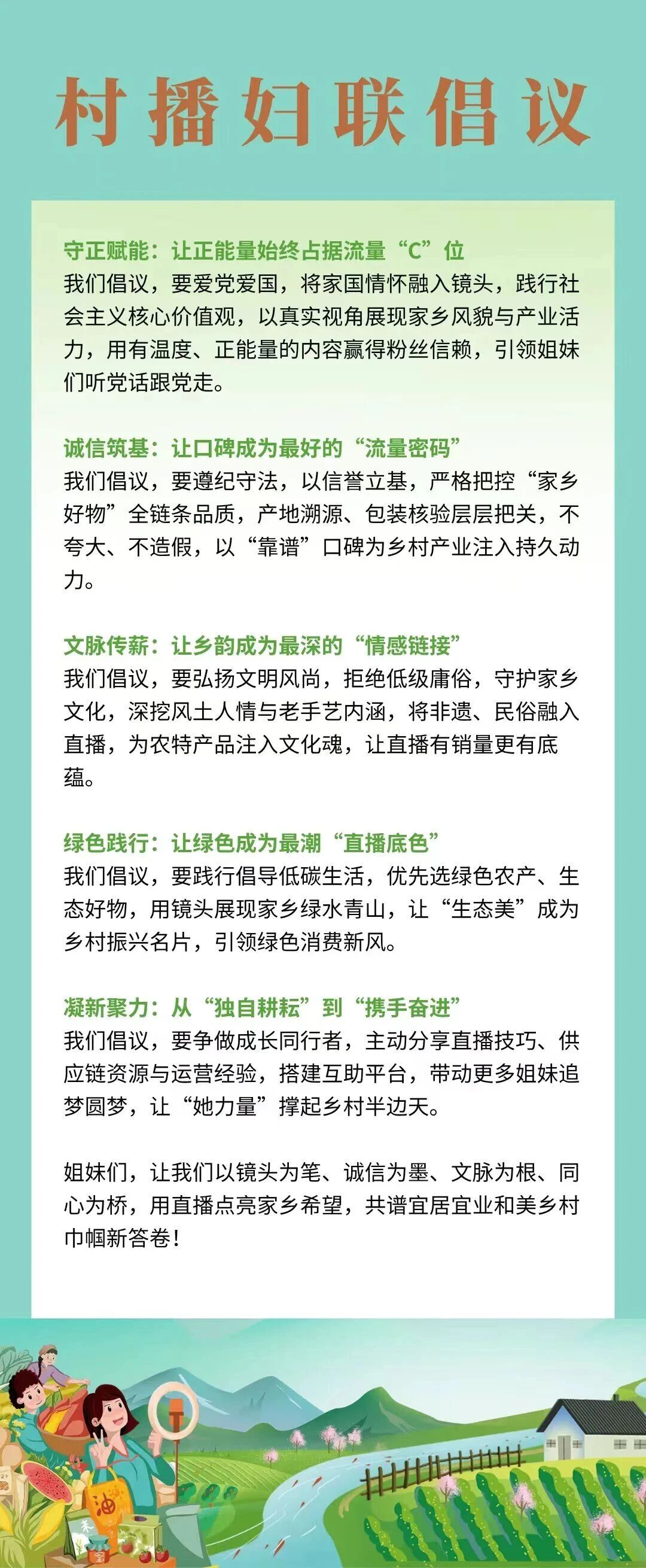 五位村播妇联代表共同发出倡议,以“守正赋能”锚定方向、“诚信筑基”坚守底线、“文脉传薪”延续根脉、“绿色践行”绘就底色、“凝新聚力”共赴新程,号召全国的女主播们坚守初心使命,凝聚巾帼合力,用直播点亮家乡希望,以实干担当共谱和美乡村巾帼新答卷。